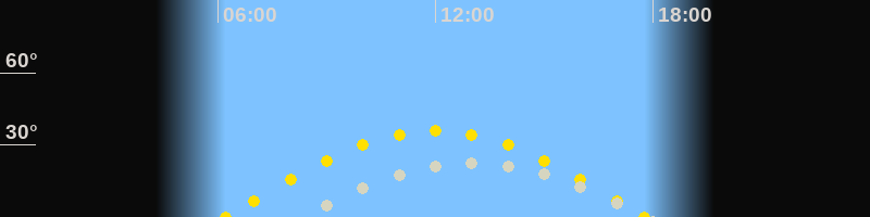 | Sonnenaufgang | 06:12 Uhr im Osten (αAz = 94.5°) |