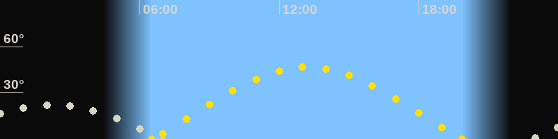 | Höchster Sonnenstand (Kulmination) | 13:11 Uhr (h = 46.7°) |
