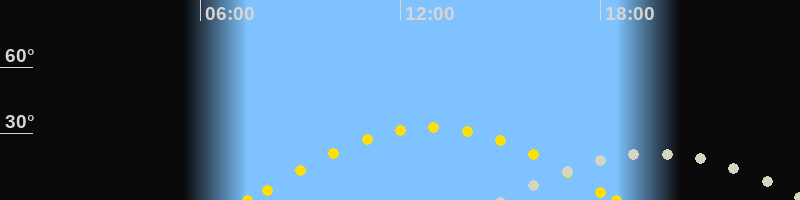 | Sonnenuntergang | 18:28 Uhr im Westen (αAz = 260.2°) |