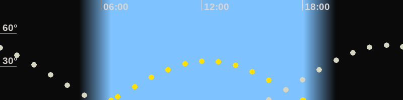 Bei Beginn der Morgendämmerung ist der Übergangshimmel Frühling/Sommer zu sehen. Im Süden stehen die Waage, der Schlangenträger und der nördliche Teil des Skorpions (der südliche ist in Mitteleuropa leider nicht sichtbar). Im Osten steht das Sommerdreieck schon recht hoch und im Südosten geht der Schütze auf.