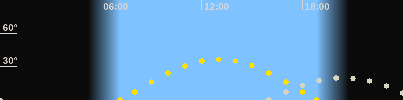 | Höchster Sonnenstand (Kulmination) | 13:00 Uhr (h = 36.7°) |