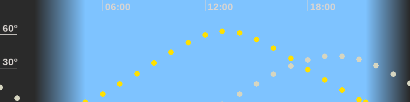 | Höchster Sonnenstand (Kulmination) | 13:11 Uhr (h = 62.7°) |