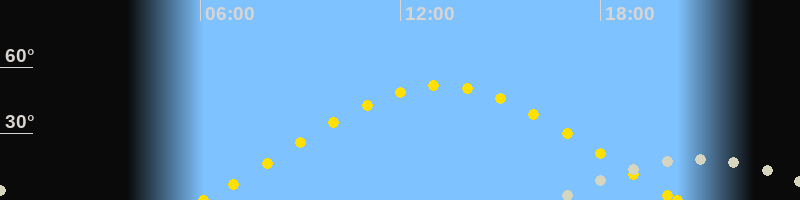 | Sonnenaufgang | 06:06 Uhr im Osten (αAz = 69.3°) |