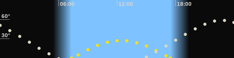 | Sonnenaufgang | 07:20 Uhr im Osten (αAz = 108.6°) |