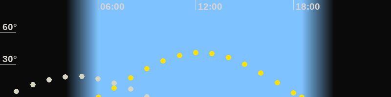 Bei Beginn der Morgendämmerung ist der Übergangshimmel Frühling/Sommer zu sehen. Im Süden stehen die Waage, der Schlangenträger und der nördliche Teil des Skorpions (der südliche ist in Mitteleuropa leider nicht sichtbar). Im Osten steht das Sommerdreieck schon recht hoch und im Südosten geht der Schütze auf.