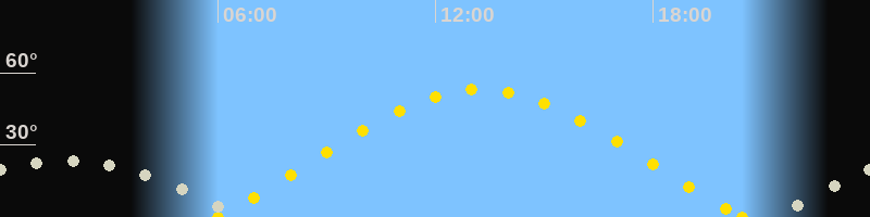 | Sonnenaufgang | 06:00 Uhr im Nordosten (αAz = 67.1°) |