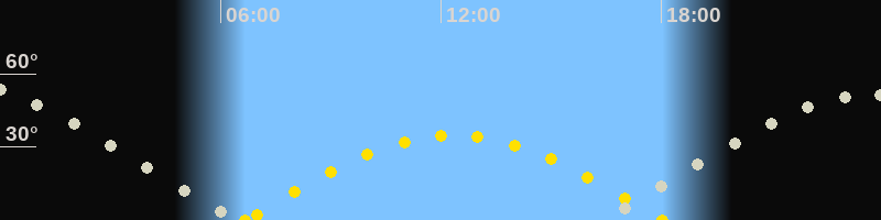 Bei Beginn der Morgendämmerung ist der Übergangshimmel Frühling/Sommer zu sehen. Im Süden stehen die Waage, der Schlangenträger und der nördliche Teil des Skorpions (der südliche ist in Mitteleuropa leider nicht sichtbar). Im Osten steht das Sommerdreieck schon recht hoch und im Südosten geht der Schütze auf.