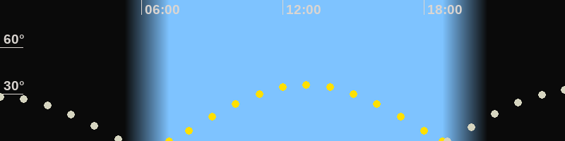 | Sonnenaufgang | 07:10 Uhr im Osten (αAz = 94°) |