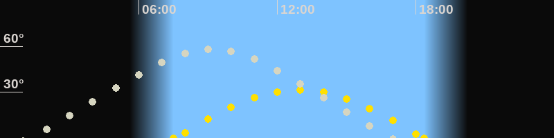 | Sonnenaufgang | 07:30 Uhr im Osten (αAz = 101.3°) |