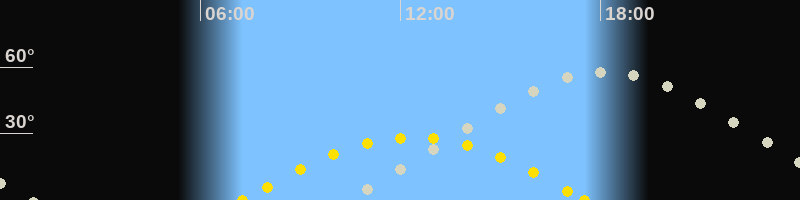 | Sonnenaufgang | 07:16 Uhr im Osten (αAz = 107.1°) |