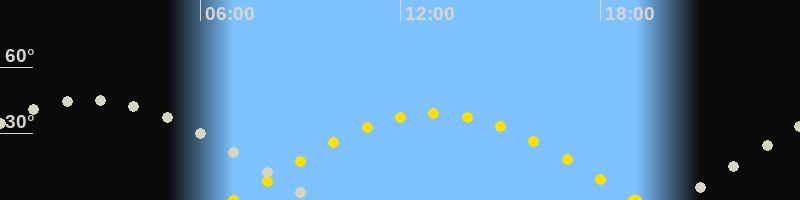 | Sonnenaufgang | 06:59 Uhr im Osten (αAz = 89.6°) |