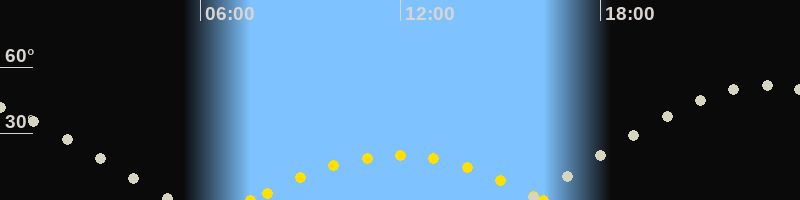 | Sonnenaufgang | 07:30 Uhr im Südosten (αAz = 120.2°) |