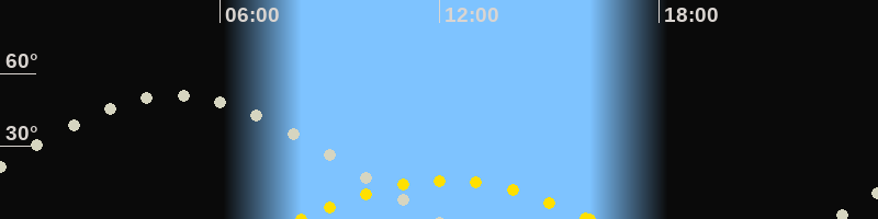 | Höchster Sonnenstand (Kulmination) | 12:10 Uhr (h = 15.9°) |