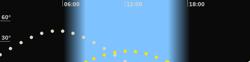 | Höchster Sonnenstand (Kulmination) | 12:10 Uhr (h = 15.9°) |