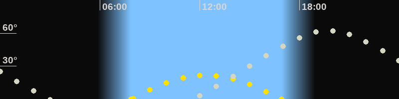 | Höchster Sonnenstand (Kulmination) | 12:23 Uhr (h = 21.6°) |