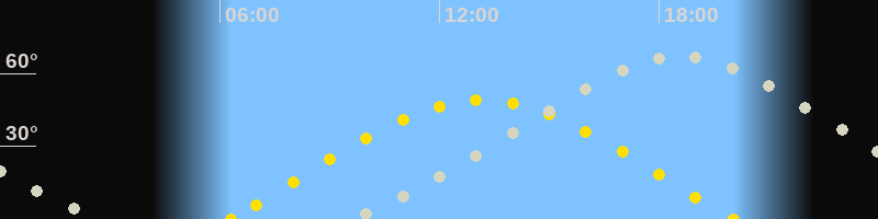 | Sonnenaufgang | 06:18 Uhr im Osten (αAz = 74°) |