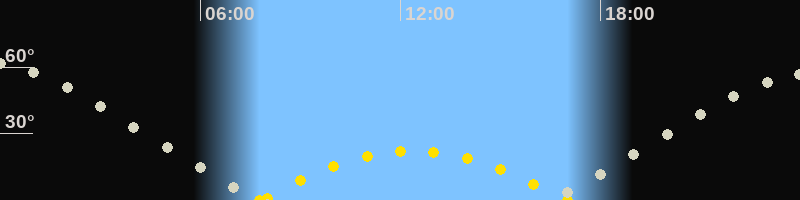 | Höchster Sonnenstand (Kulmination) | 12:23 Uhr (h = 22.3°) |