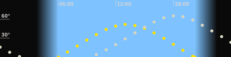 | Sonnenaufgang | 06:03 Uhr im Osten (αAz = 69.8°) |