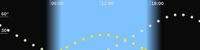 | Sonnenaufgang | 07:20 Uhr im Osten (αAz = 108.5°) |