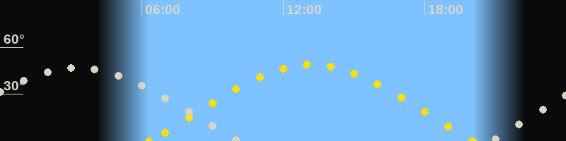 | Sonnenaufgang | 06:18 Uhr im Osten (αAz = 73.4°) |