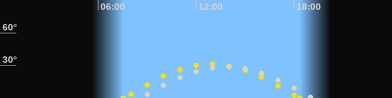 | Sonnenuntergang | 18:20 Uhr im Westen (αAz = 258.1°) |