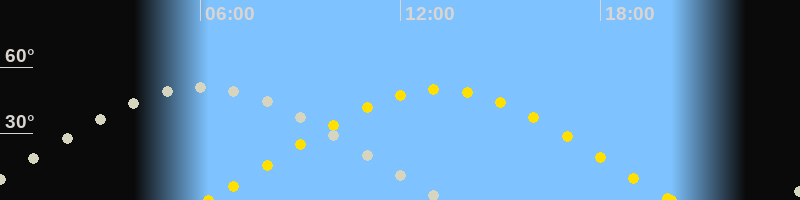| Sonnenaufgang | 06:14 Uhr im Osten (αAz = 72°) |