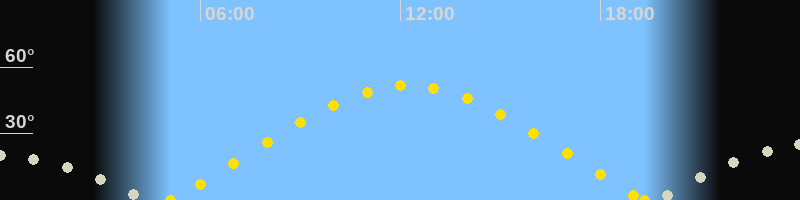 | Sonnenaufgang | 05:06 Uhr im Osten (αAz = 69.3°) |